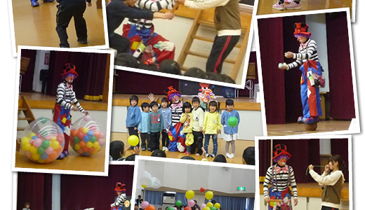 和歌山県新宮市の三輪崎保育園の園長先生より連絡があり、2013年3月7日に被災地支援パフォーマンスが実現しました。地元4園、総勢210名の園児が三輪崎会館に集まり、バロンも1人1人に励ましの気持ちで演じたようです。