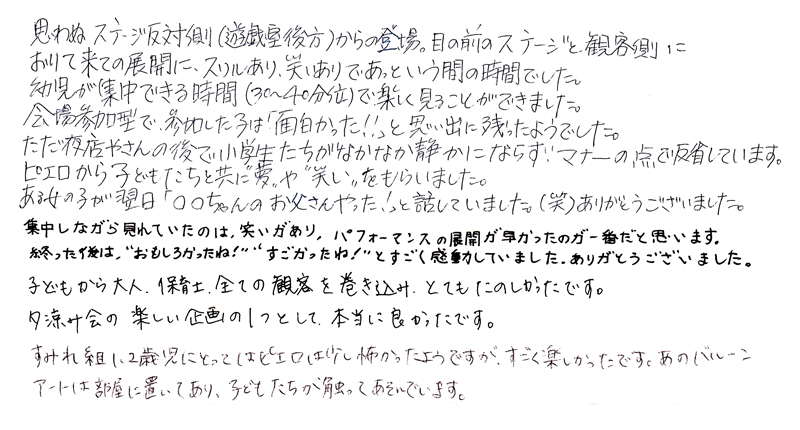 「とっても楽しかったです。思い出に残るお楽しみ会でした。言葉がなくてもひきつけられて目が離せませんでした。子供も大人も、次は何をするのかな!?とドキドキワクワクする素敵な時間でした。また見たいと思います。」