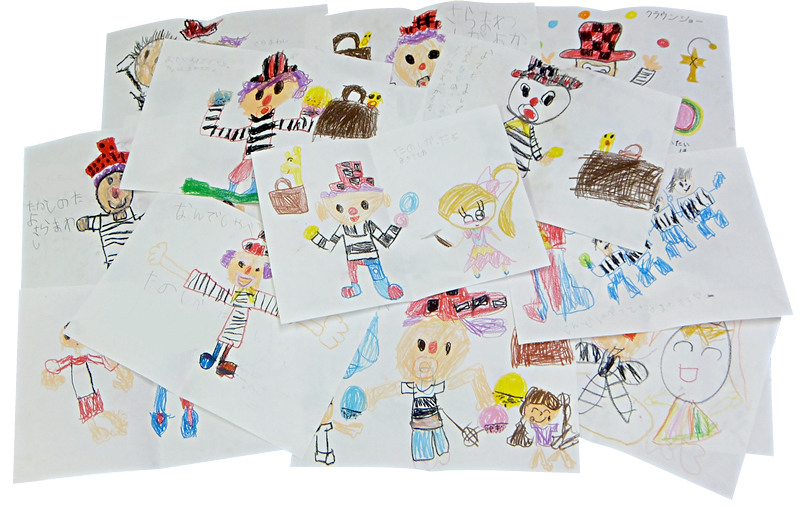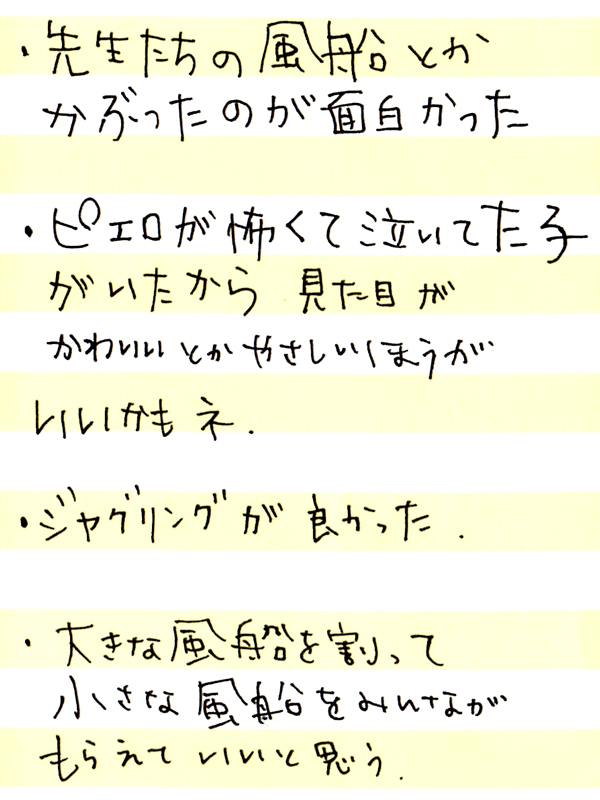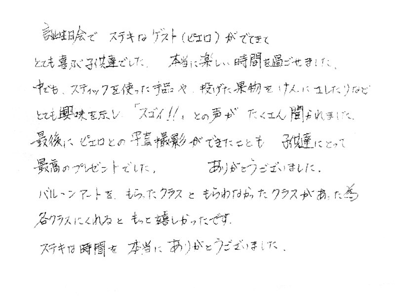 「ピエロのまじっくはすごかったです。ふうせんをくれてありがとう。たのしかったよ。」