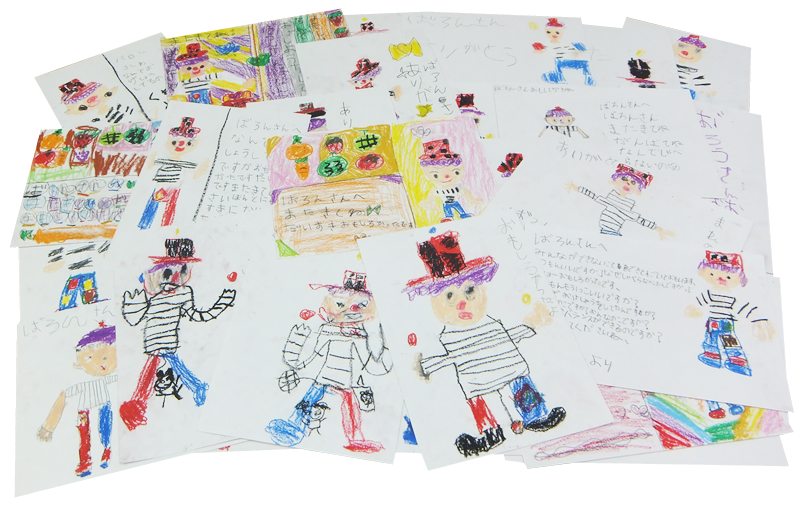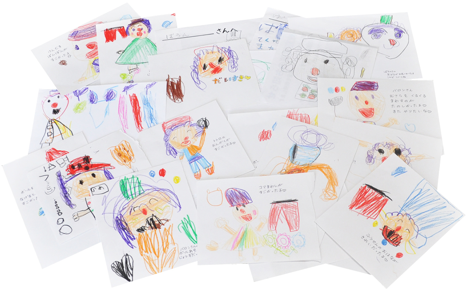 「ぴえろさん、たのしかったよ。ふうせんもぜんぶすごかったよ。けんだまはかっこよかったよ。またつくってね。」 |