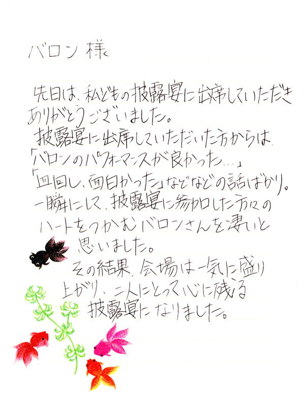 「バロンさん、本当に楽しかったです。子供達も初めて目の前でピエロさん(本物)を見れて、すごく喜んでました。これからもがんばって下さい。いつかまたバロンさんにあいたいと子供が言ってました。」