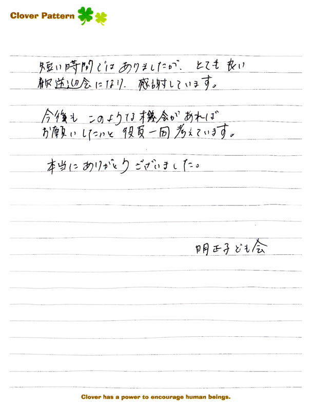 「とても素敵なマジックで子ども達を楽しませて頂き、ありがとうございました。職員も参加できる機会を作って頂けたことで、より一層親近感がわいたようでした。また遊びにいらして下さい。楽しみにしています。」